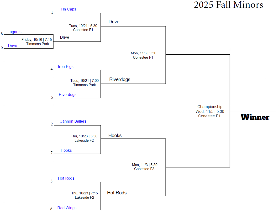 Each season, Greenville Little League hosts a post-season tournament for its Spring and Fall regular season teams in the CP Prep, Coach Pitch, Minors, Majors, and Juniors baseball divisions. The 2025 Fall Tournament is scheduled to start on October 16th. Tournament brackets are posted below (click the link for the Bracket).